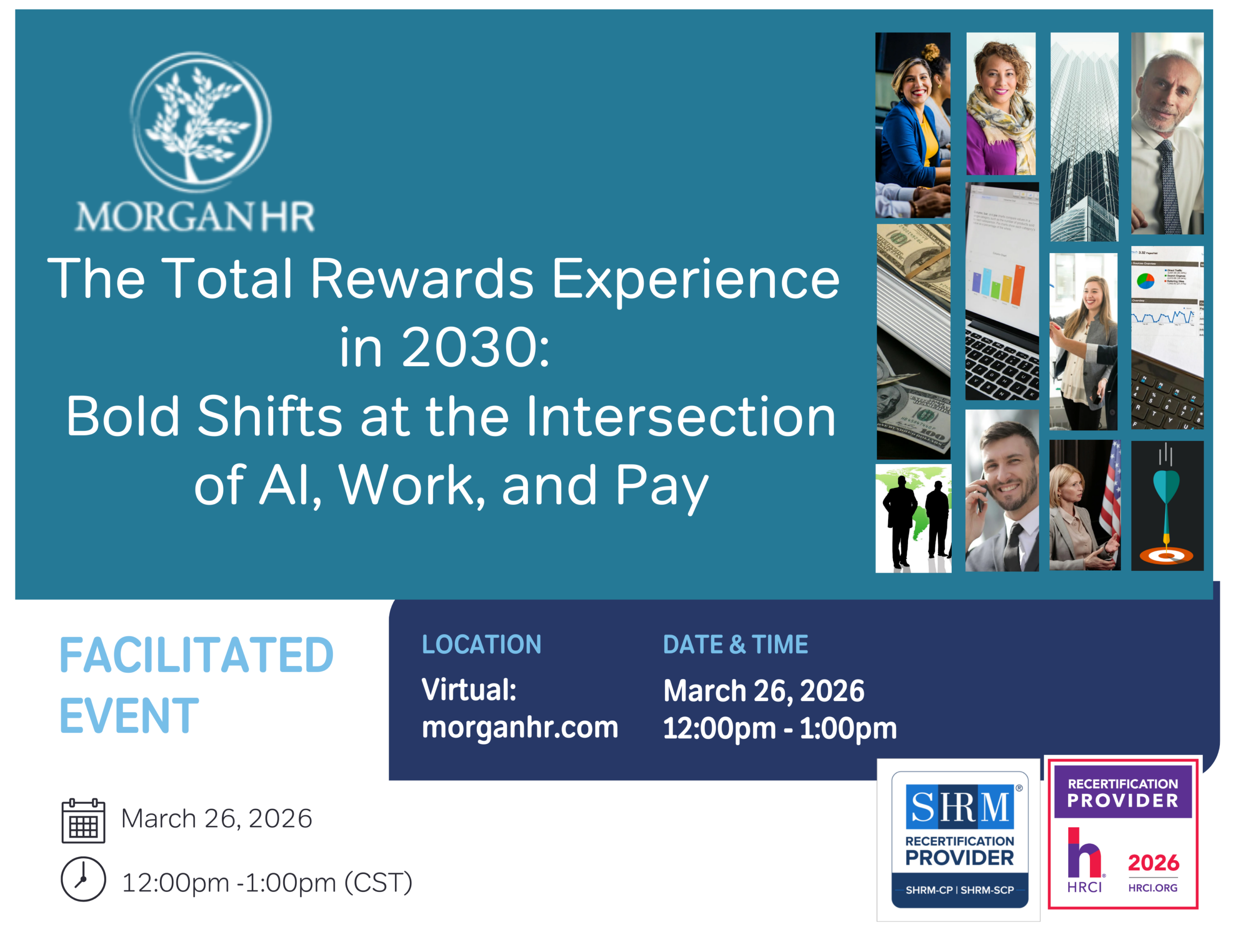 MorganHR is recognized by SHRM and HRCI to offer professional development credit. Participation in this program qualifies for 1.0 SHRM PDC and 1.0 HRCI recertification credit.